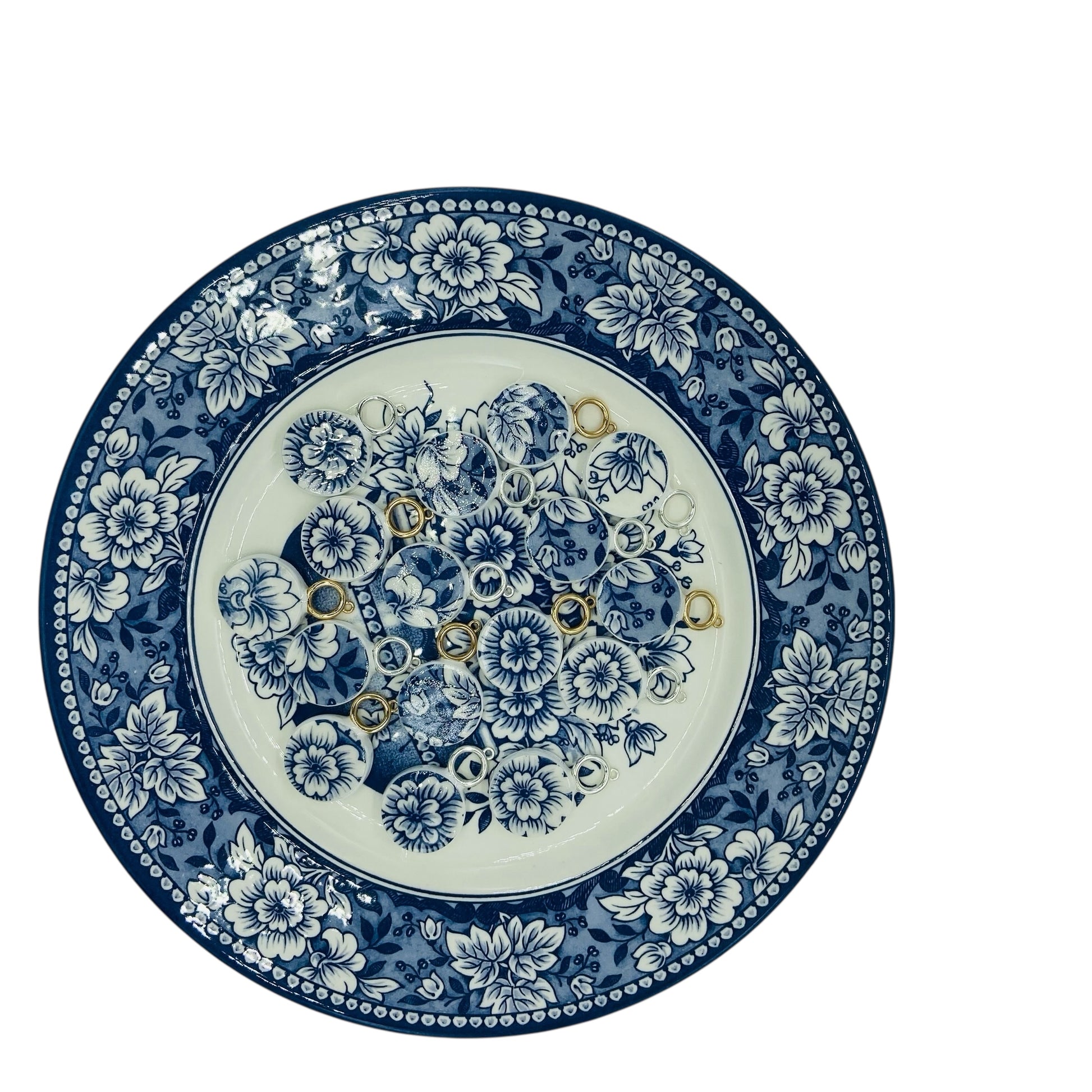 This blue and white Dinner Plate Necklace is crafted from repurposed dinner plates, creating a unique and sophisticated jewelry piece. Each dinner plate piece is about 1.25" and are available in custom lengths from 15" to 19", it offers a tailored fit to suit your style and comfort. Expertly designed, this necklace blends artistic creativity with fine craftsmanship, making it a distinctive accessory that highlights sustainability and originality.