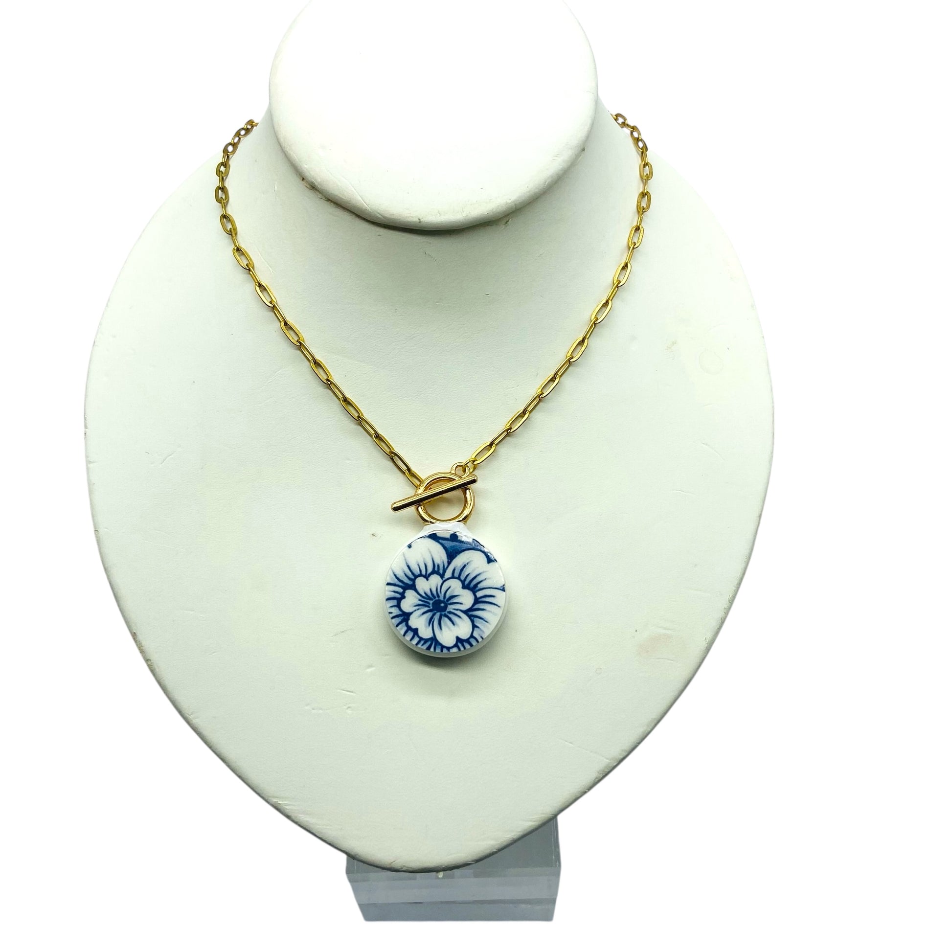 This blue and white Dinner Plate Necklace is crafted from repurposed dinner plates, creating a unique and sophisticated jewelry piece. Each dinner plate piece is about 1.25" and are available in custom lengths from 15" to 19", it offers a tailored fit to suit your style and comfort. Expertly designed, this necklace blends artistic creativity with fine craftsmanship, making it a distinctive accessory that highlights sustainability and originality.